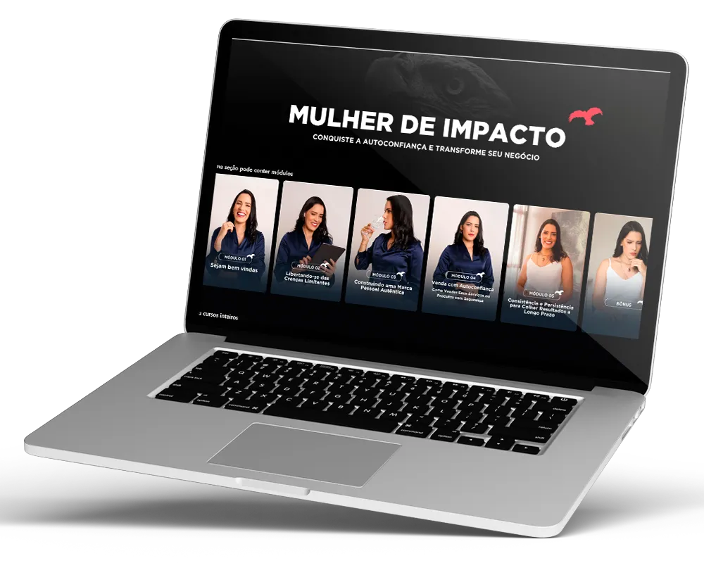 O Método Mulher de Impacto é uma estrutura transformadora, feito para mulheres empreendedoras que querem vencer as barreiras emocionais que impedem de crescer e prosperar. Aqui, você vai aprender a superar a insegurança, construir uma mentalidade de expansão, se posicionar como autoridade no digital e vender seus serviços ou produtos com confiança.